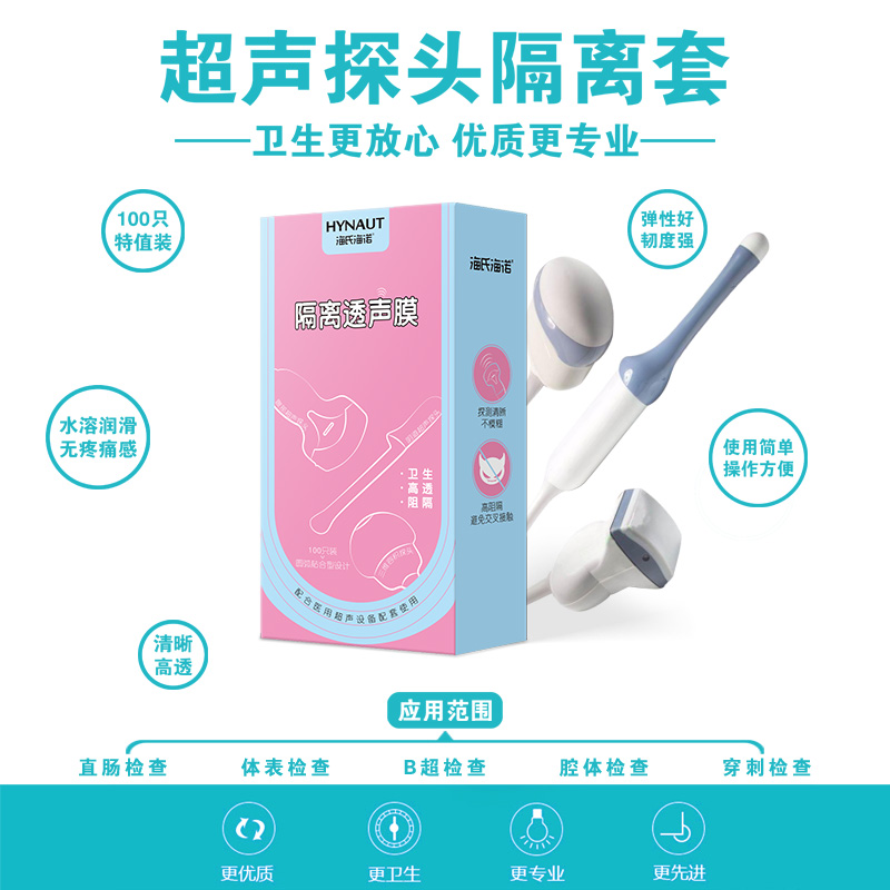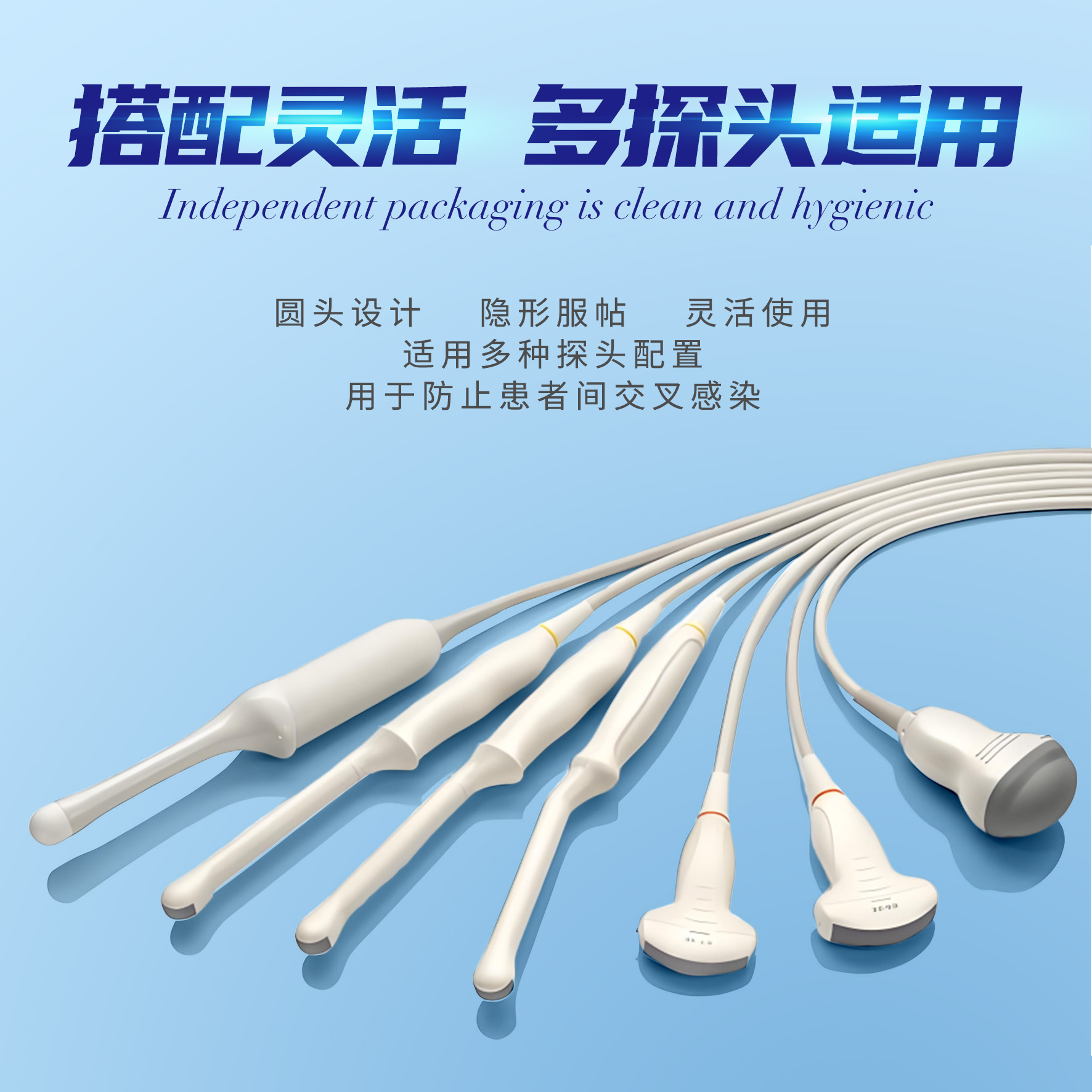 适配医院多种超声设备,如腹部超声探头、三维容积探头、阴道超声探头等,安装于超声探头的透声窗上,避免超声探头与人体皮肤的直接接触,以防止交叉感染和医源性感染的发生。多探头一次性适用,方便清洁、省事并减少医务人员的工作负担。