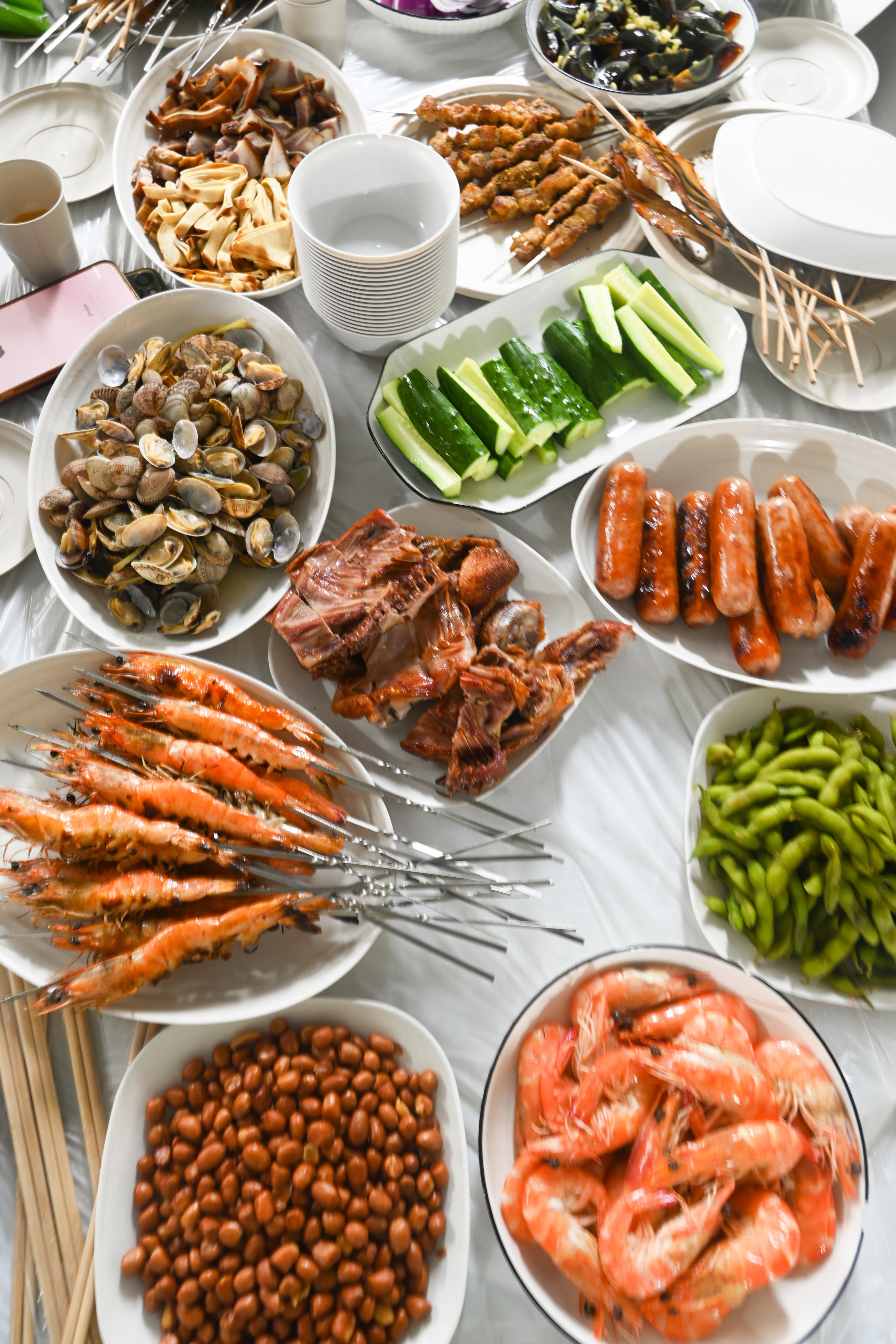 滋滋冒油的羊肉串、金黄酥脆的鸡翅、外焦里嫩的烤鱿鱼,还有新鲜脆爽的烤蔬菜......一桌桌香气四溢的美食摆满了整个餐桌。