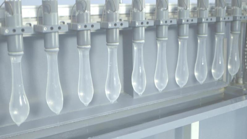 还有透水检测。用它们套住一个个的金属环,套套内注入水,然后金属环会通电。接着,再将整个套套浸入水中。如果这一组中的某个套套有泄漏,检测的机器会测到电流,报告漏电啦!